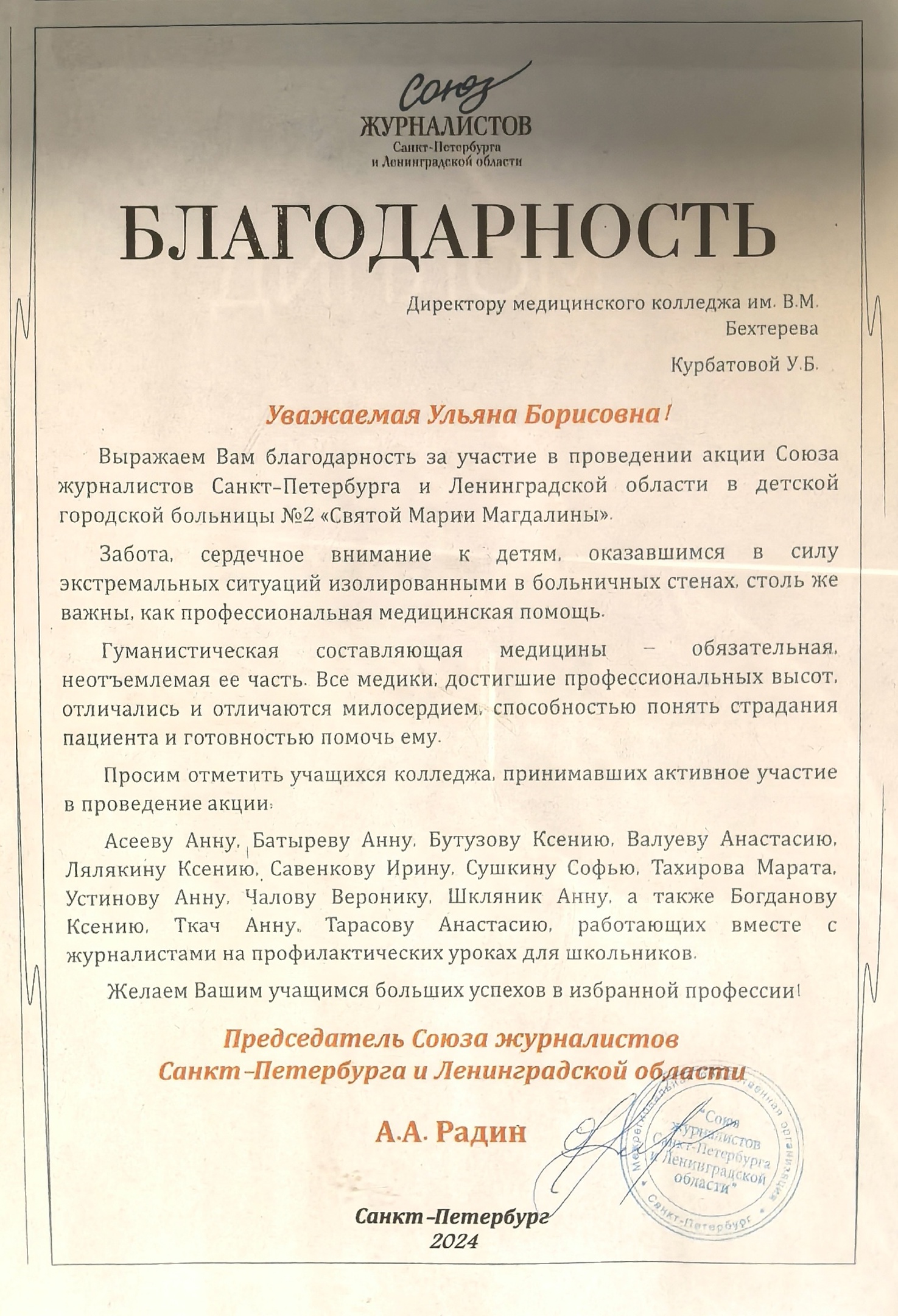 При прохождении производственной практики в сентябре и октябре 2020 г. наши студенты получили отзыв от сотрудников ГБУ СПБ НИИ Скорой помощи им. И.И. Джанелидзе. за отличную работу, за чуткое, доброжелательное отношение к пациентам, за любовь к выбранной профессии и за большую помощь в работе персоналу. Спасибо за добросовестное отношение к практике!